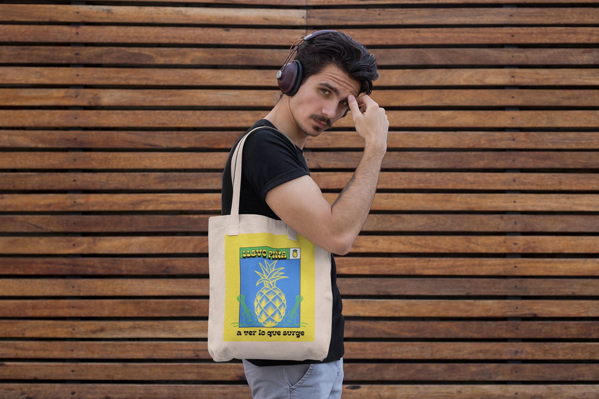 Nuestra tote bag amarilla es el complemento ideal para quienes llevan el verano por dentro y el humor por delante. Con un diseño de piña acompañado de la frase “Llevo piña, a ver lo que surge”, esta bolsa no solo es práctica, también arranca sonrisas allá donde vayas.
